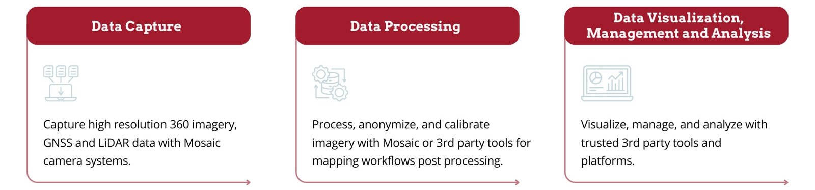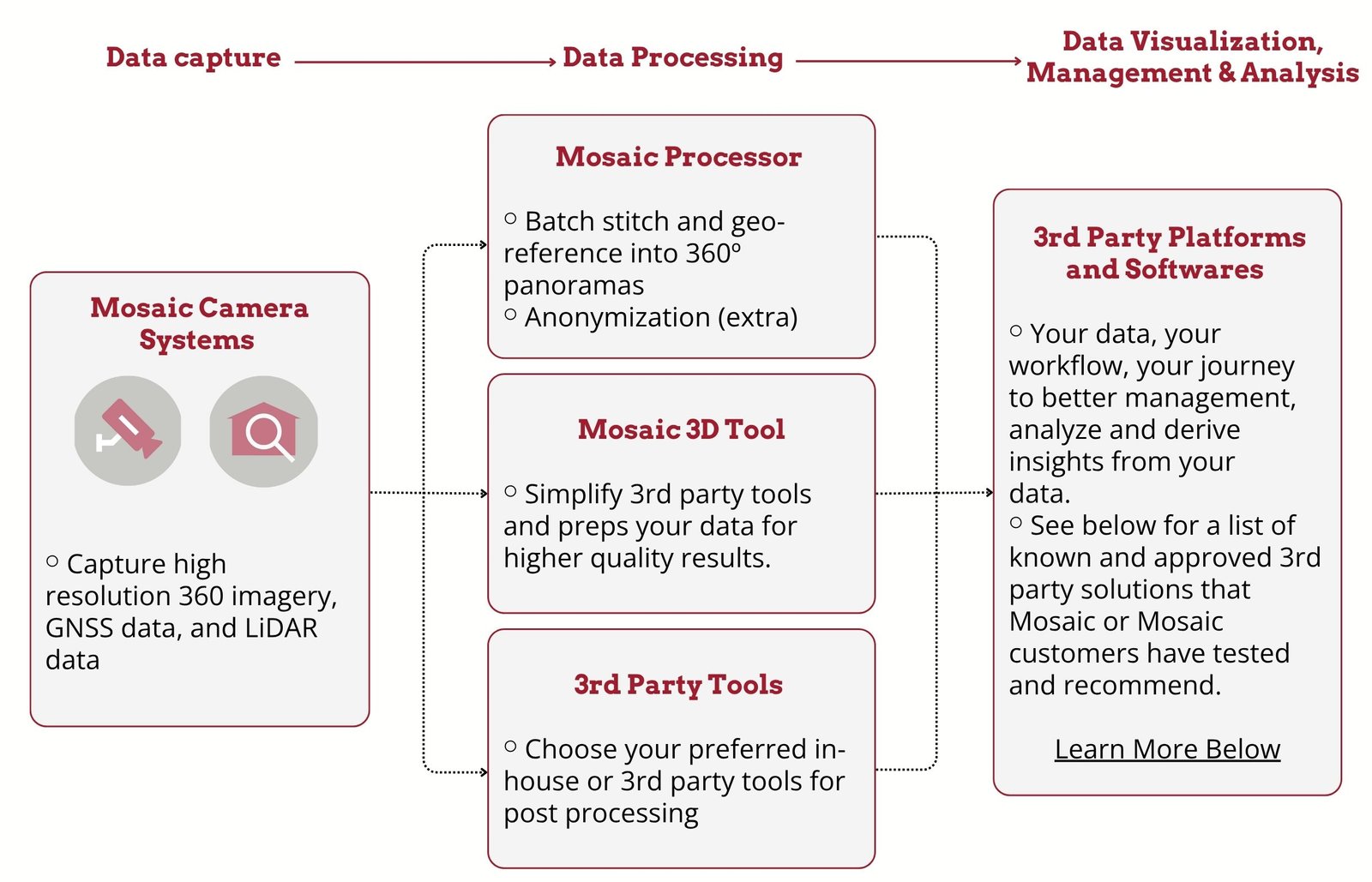 Mosaic camera systems capture and store data onboard on a hot-swappable SSD, using open formats that integrate seamlessly with your existing or preferred workflow.